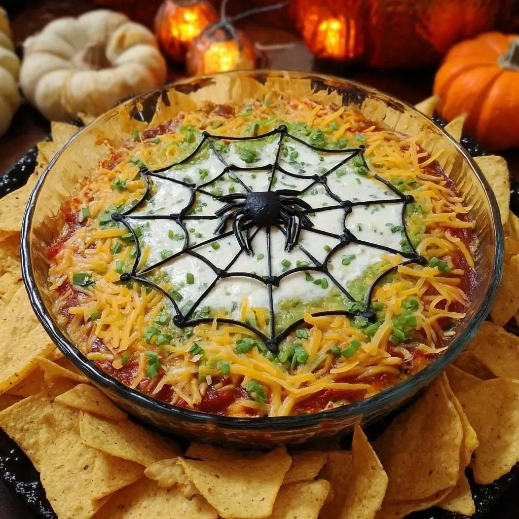 - Top with Chips: Gently press 1 cup of lightly toasted tortilla chips onto the cheese layer. Arrange them in a circular pattern, leaving a small gap in the center for the spider‑web effect. The chips should be slightly damp to help them adhere but not so wet that they become mushy.